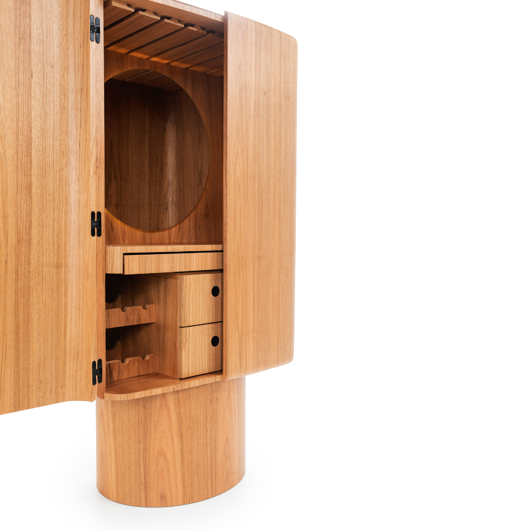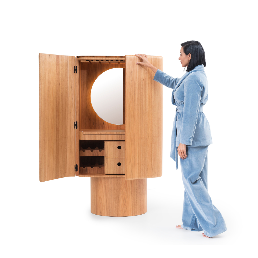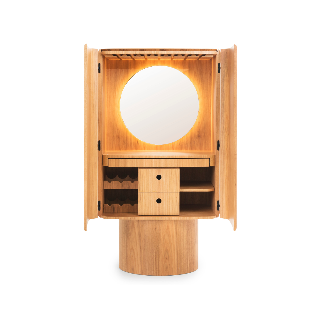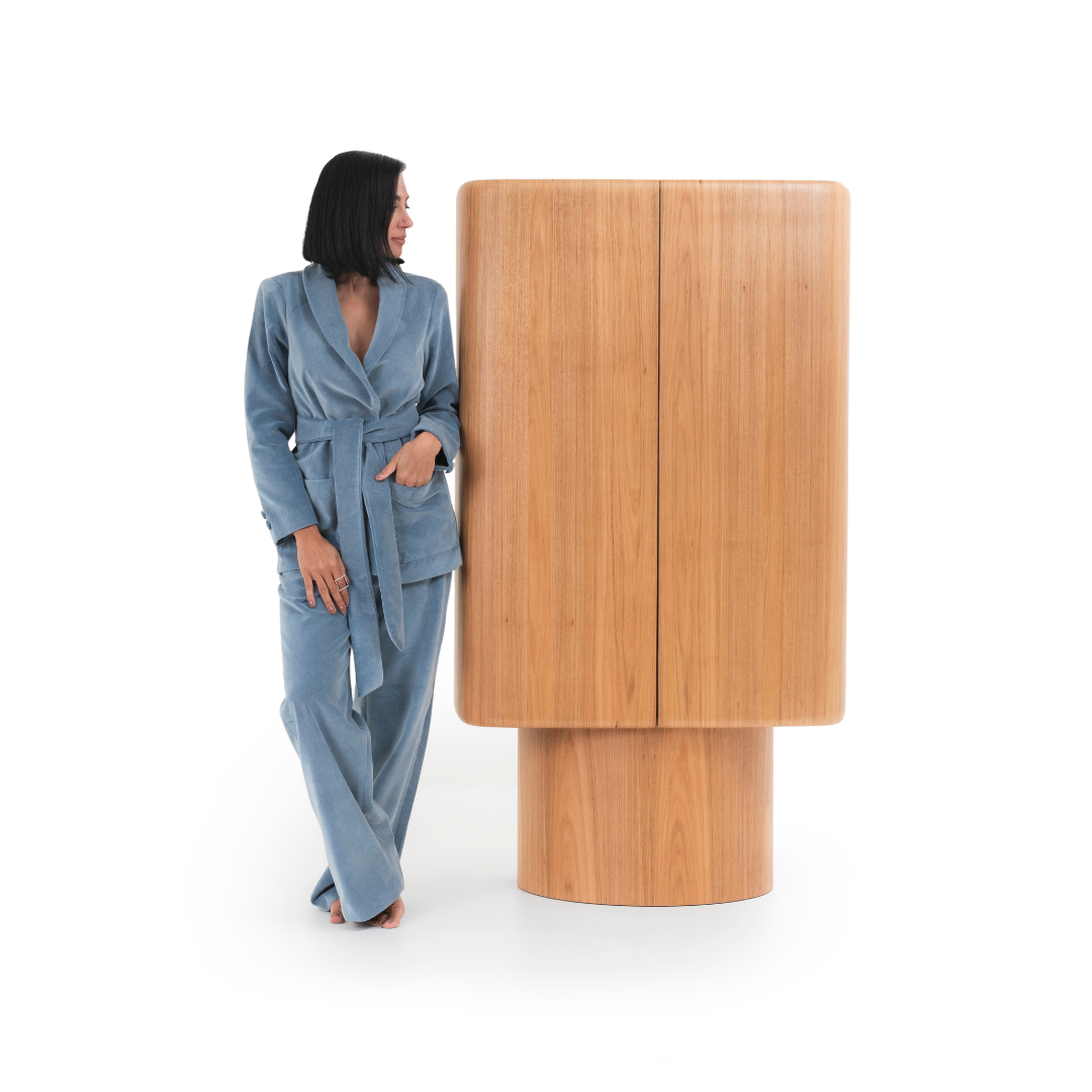 Apoiado sobre uma base contínua, menor que o corpo superior, cria a sensação visual de flutuação e leveza, como se o módulo estivesse cuidadosamente “equilibrado”.