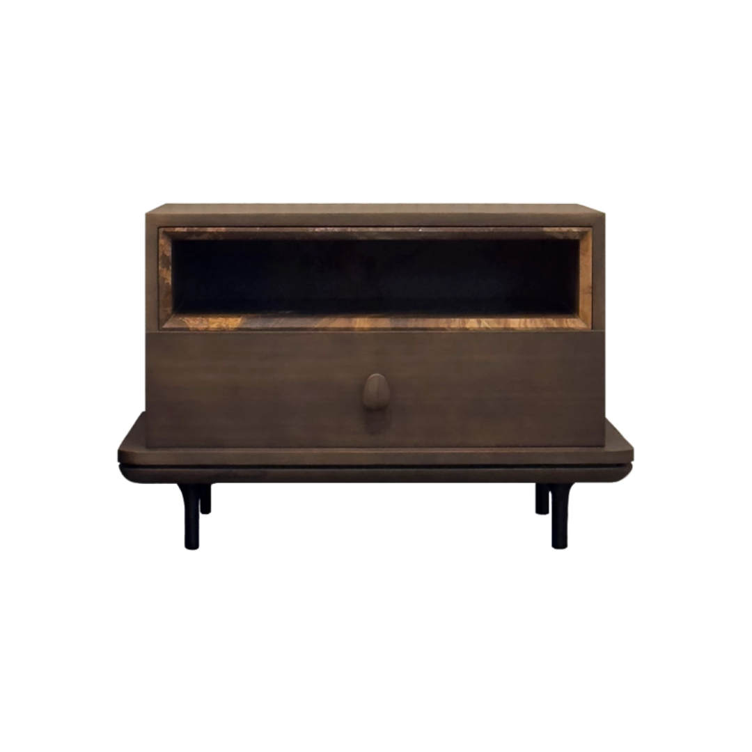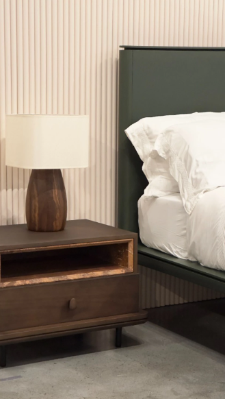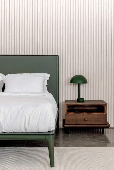 A mesa de cabeceira Hollie é parte da família homônima, caracterizada pelo quadro em madeira arredondado que serve de plataforma para múltiplas opções. Nichos abertos e gaveteiros formam ricas possibilidades de utilização, característica do poder de personalização do desenho.
