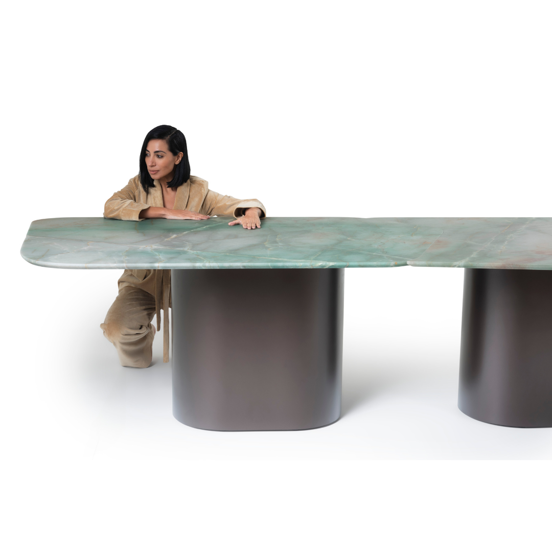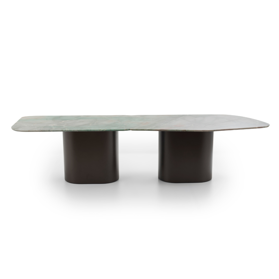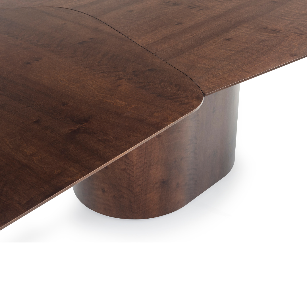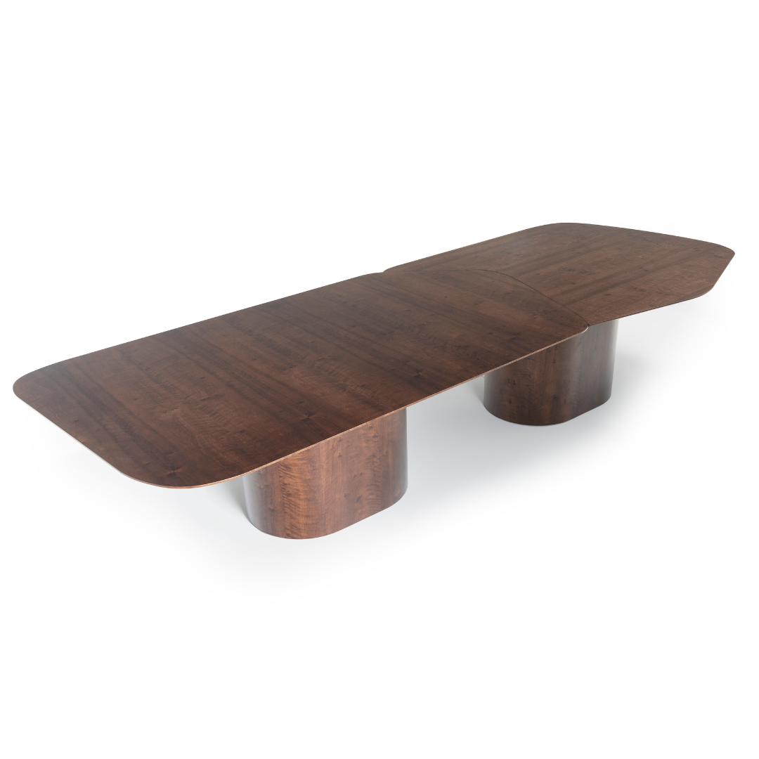A peça é bipartida, e esse gesto proposital torna-se manifesto visual: as metades se fundem de forma fluida, mas sem anular suas individualidades. Cada parte preserva sua própria veia, forma, textura e posição.