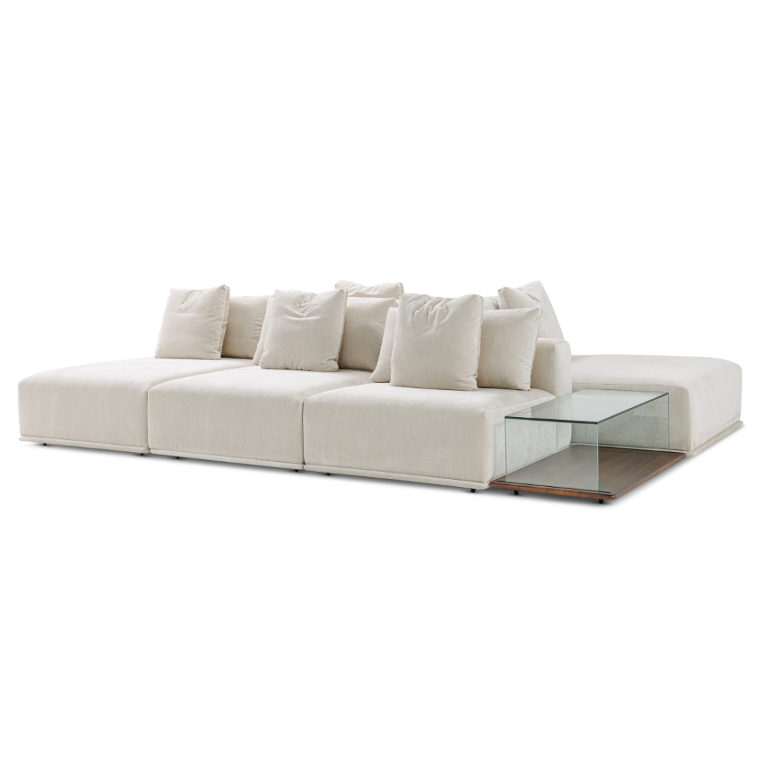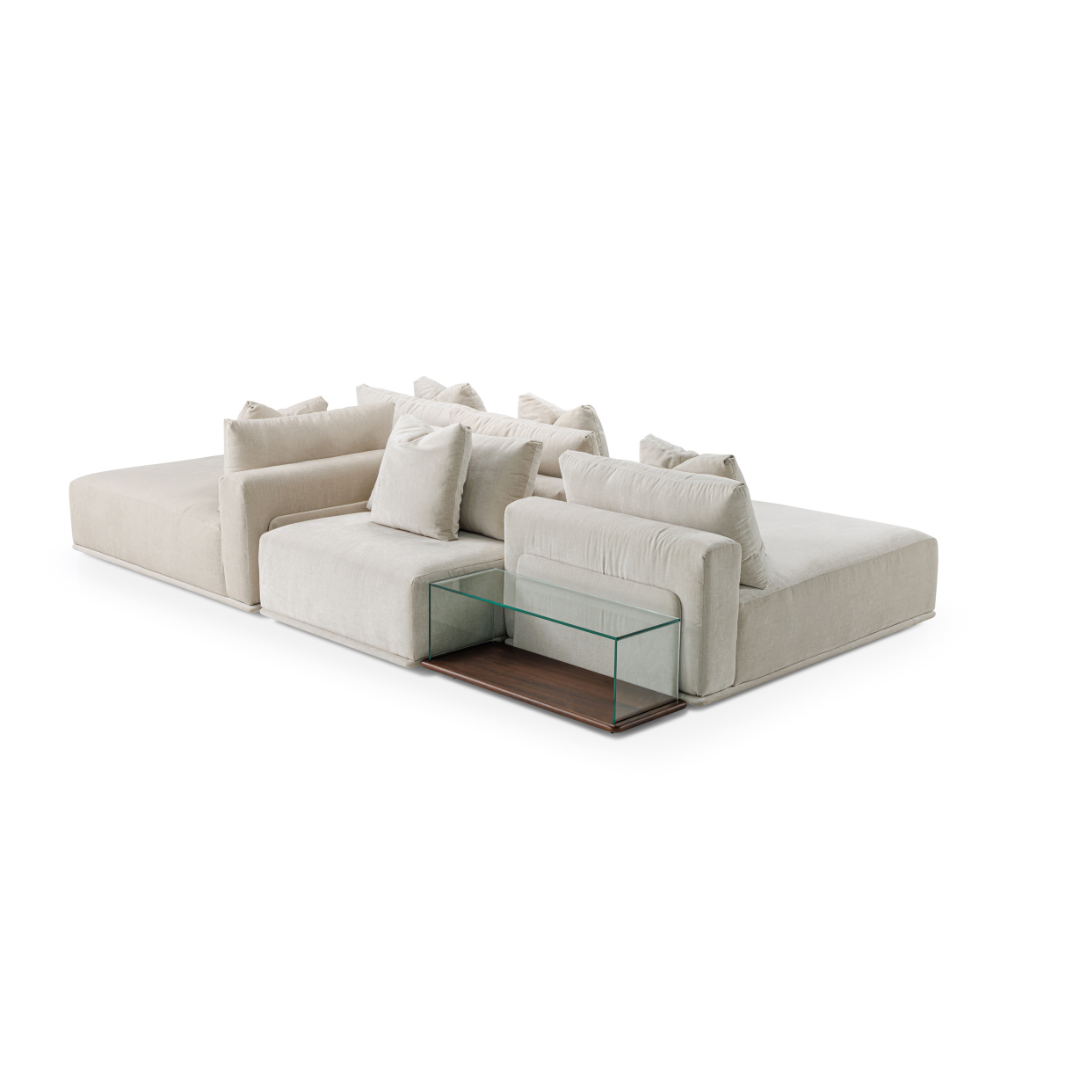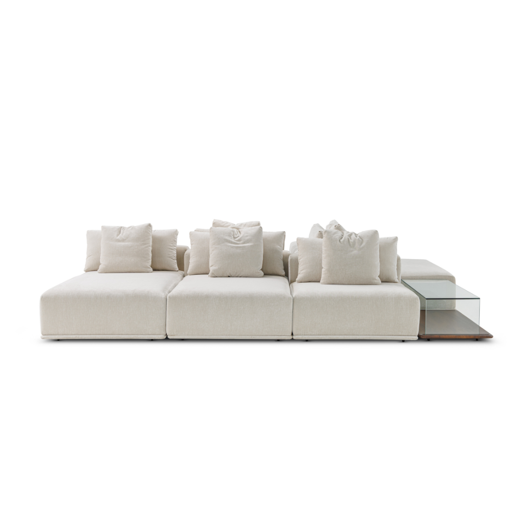 Com formas acolchoadas contínuas até o chão, reforçando a sensação de unidade e volume. O sofá assume um caráter monolítico e escultórico, funcionando tanto como peça isolada quanto como bloco arquitetônico componível — permitindo montagens em ilha, ou alinhadas, de acordo com a configuração espacial de cada ambiente, possibilitando conversações em 360º ou a montagem de “salas dentro da sala”.