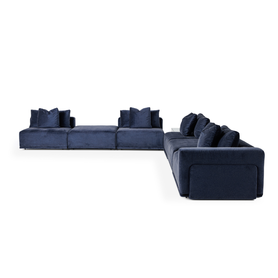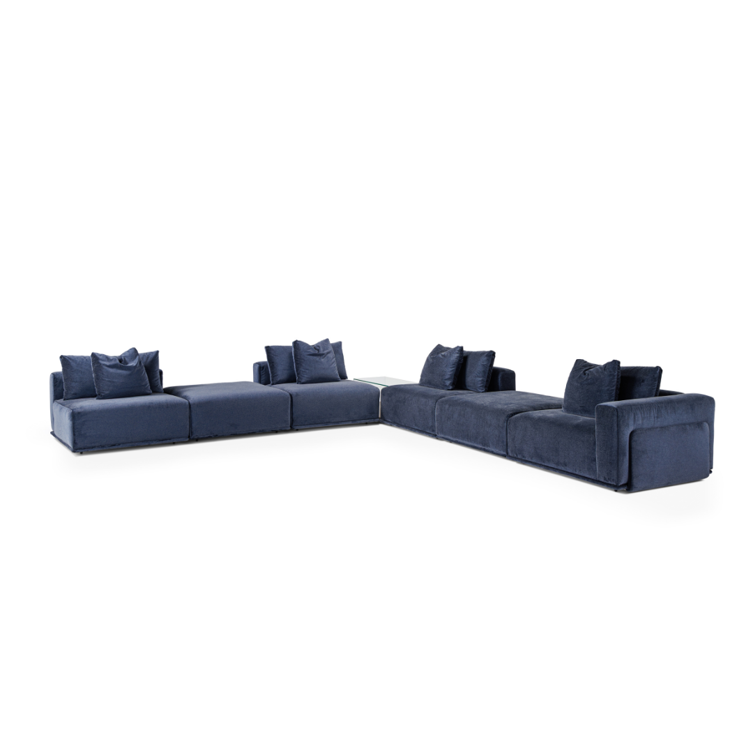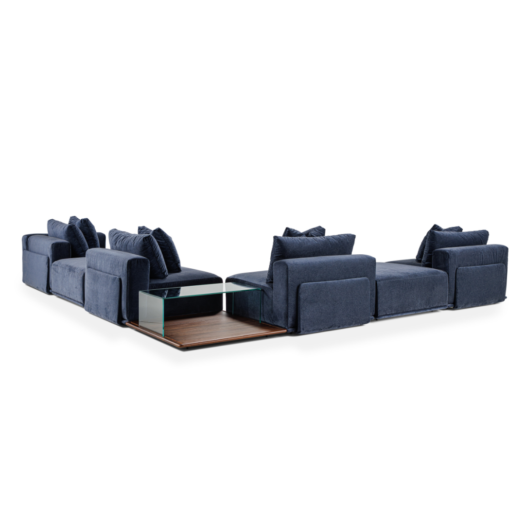 Com formas acolchoadas contínuas até o chão, reforçando a sensação de unidade e volume. O sofá assume um caráter monolítico e escultórico, funcionando tanto como peça isolada quanto como bloco arquitetônico componível — permitindo montagens em ilha, ou alinhadas, de acordo com a configuração espacial de cada ambiente, possibilitando conversações em 360º ou a montagem de “salas dentro da sala”.